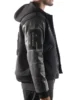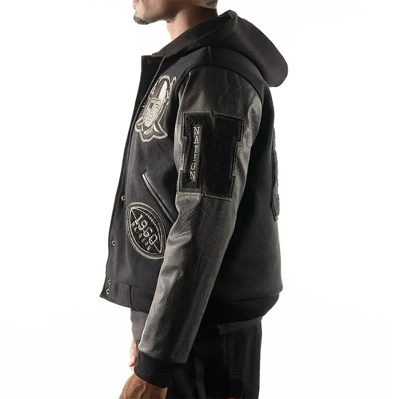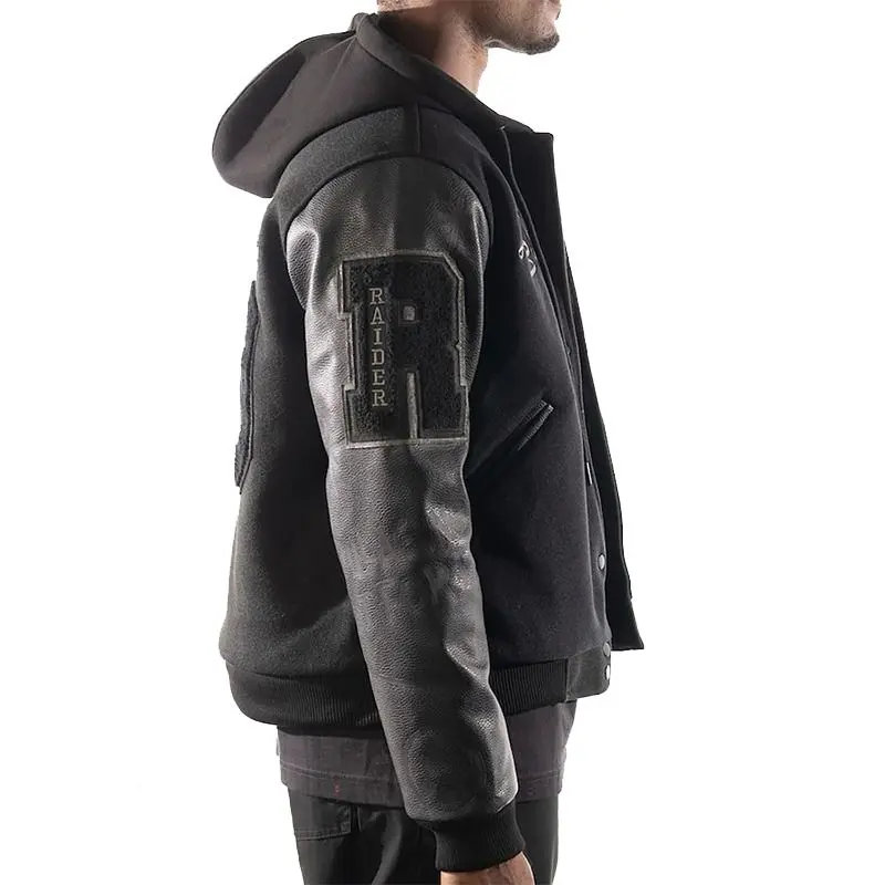 The iconic Las Vegas RAIDERS x THE WILD COLLECTIVE Black Varsity Jacket is made with the finest wool & leather fabric. The innermost lining is a soft viscose material. This jacket will make you stand out in any fashion setting. Add a captivating texture to your look with the fascinating black color of this jacket. Modernity in this classic LV RAIDERS Jacket is brought to your go to look with an exquisite snap- tab button closure and hooded collar.