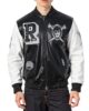Design: Classic varsity jacket silhouette with ribbed stand-up collar, cuffs, and hem