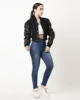 Make a bold fashion statement with our Black Wool & Black Leather Letterman Crop Top Jacket from JacketsByT, perfect for those who appreciate both style and quality craftsmanship.